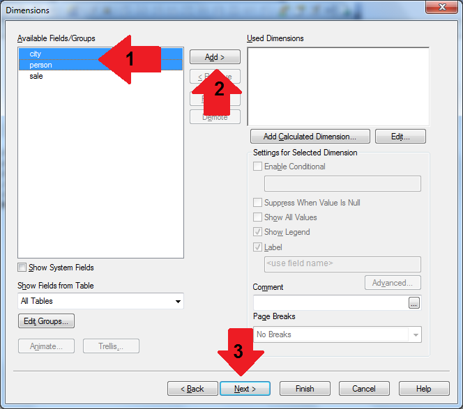 • از قسمت Available Fields/Groups گزینه های city و person را انتخاب کرده و دکمه Add و سپس Next را بزنید(مطابق تصویر زیر)