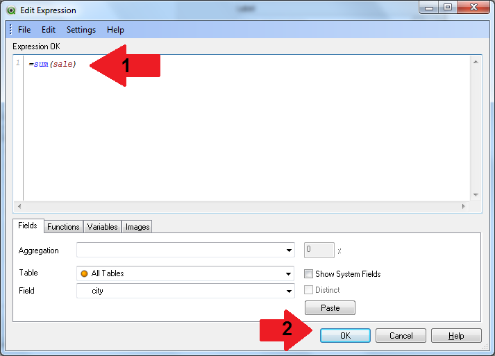 • در صفحه Edit Expersion مقدار Sum(sale) را تایپ و OK کنید(مطابق شکل زیر)