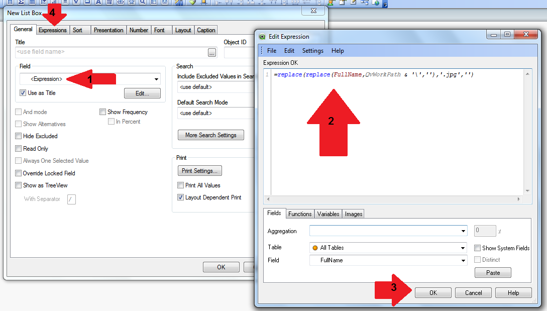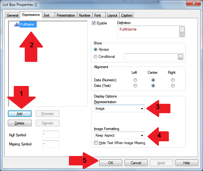 حال Tab مربوط به Experssions را انتخاب و با زدن دکمه Add و انتخاب FullName فیلد عکس برای نمایش را انتخاب کرده و گزینه Representation را به مقدار Image و گزینه Image Formatting را به Keep Aspect تنظیم کرده OK کنید(به تصویر توجه شود).