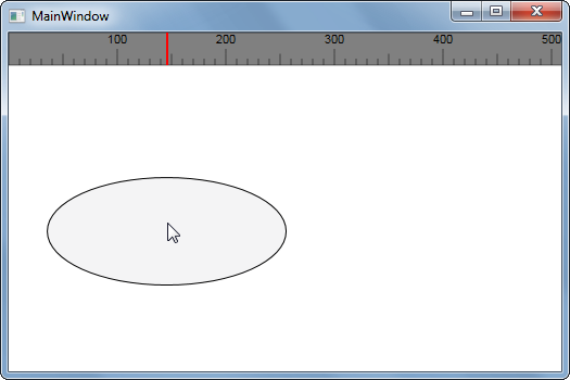 در کد بالا به کانواس نام mycanvas داده‌ایم و برای ویژگی Diagram خطکش‌مان آن را با استفاده از دستور Binding و ElementName به کانواس مرتبط کرده‌ایم. برنامه را ذخیره کرده و با استفاده از ویژگی اسکیل مربوط به خطکش اسکیل کانواس‌ و خطکش‌تان را تغییردهید. سپس با اجرای برنامه و حرکت دادن موس روی شکل بیضی‌گون نشانه‌گر را در خطکش خواهید دید(دقت کنید ایونت موس‌مووو فقط روی اشکال و اشیای درون کانواس کار می‌کند). اگر نیاز به خطکش عمودی دارید آن را به برنامه بی‌فزایید.